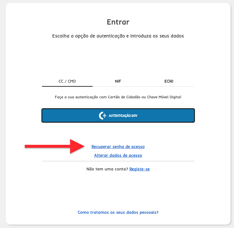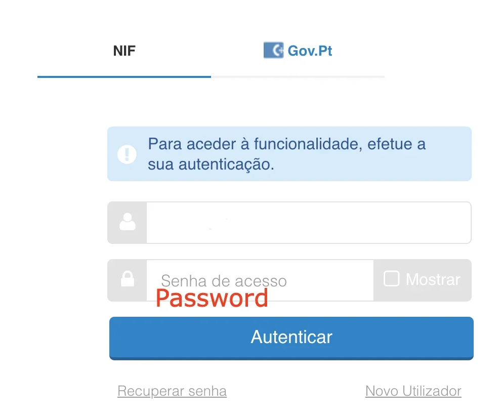 Use “Recuperar Senha” (Recover password). Depending on your setup, you may recover by SMS (fast), by letter to your fiscal address, or via authentication.gov (Citizen Card/Digital Mobile Key).
