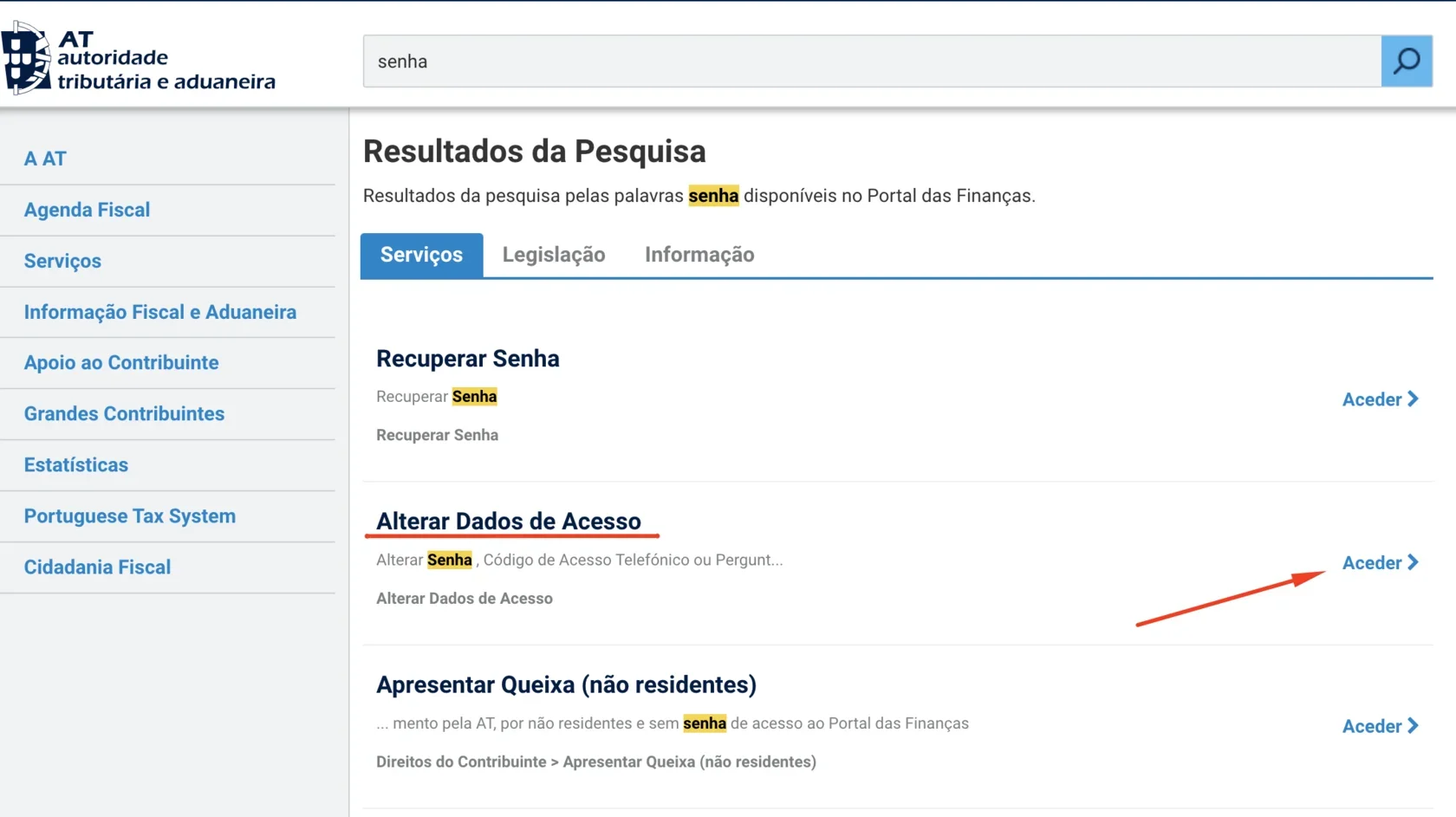 In the portal search bar, type “alterar dados de acesso” and open the corresponding page (Change access data).
